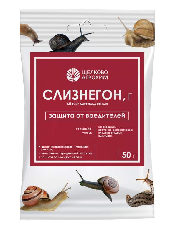 «Слизнегон, Г» с удвоенной концентрацией метальдегида предназначен для борьбы со слизнями и улитками на овощах, ягодах, декоративных культурах и винограде. Препарат выпускается в виде гранул, которые нужно равномерно рассыпать в местах частого скопления улиток, между грядками, вокруг растений или заложить в ловушки. Действие препарата начинается через несколько минут после контакта с вредителями, и в течение нескольких часов они погибают. Метальдегид попадает в организм вредителей двумя путями: через кожные покровы после соприкосновения с гранулами и с пищей. «Слизнегон, Г» повреждает слизистые клетки в пищеварительном тракте, после чего моллюски теряют жидкость, высыхают и умирают.